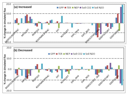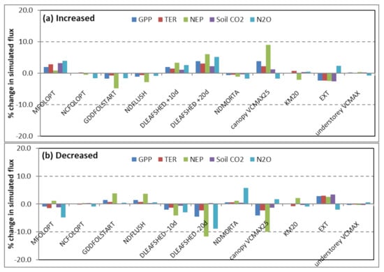 Sensitivity tests showing % change in simulated annual CO2 and N2O fluxes with chosen PSIM module parameter values (a) increased by 10% and (b) decreased by 10% (except DLEAFSHED: changed by 10 days and 20 days).