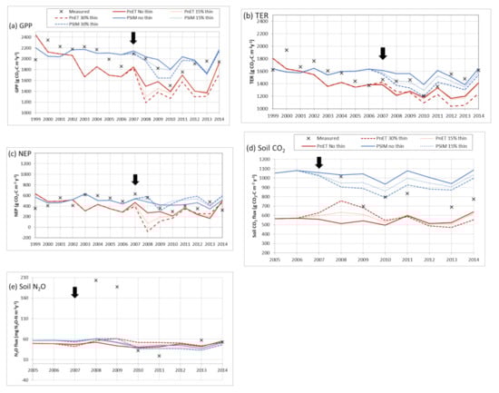 Annual eddy covariance CO2 and soil gas flux measurements at the Straits Inclosure Tower Site for: (a) GPP, (b) TER, (c) NEP, (d) soil CO2 and (e) soil N2O compared with simulated values from PnET, and PSIM with a 0%, 15% and 30% thinning event in September 2007 (marked with black arrow).