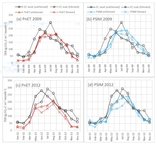 Monthly TER at the Straits Inclosure for 2009 (a,b) and 2012 (c,d). Measured EC TER data are separated into data originating from the eastern (thinned) sector and western (unthinned) sector []. Equivalent simulated TER data are shown for PnET (a,c) and PSIM (b,d) with 0% and 30% thinning after separating results depending on the daily wind direction.