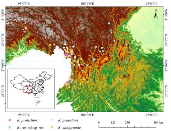 Occurrence data were obtained from published studies, the China Digital Herbarium (http://www.cvh.ac.cn/, accessed on 1 October 2021), and GBIF (https://www.gbif.org/, accessed on 1 October 2021). In accordance with the biological and ecological characteristics of these species, we removed unreasonable sites to ensure geographic accuracy. Each sample point was at least 2 km apart to reduce the effect of spatial autocorrelation. Then, we obtained 24, 22, 15, and 39 effective localities of Rhododendron protistum, Rhododendron rex subsp. rex, Rhododendron praestans, and Rhododendron sinogrande in Southwest China for the subsequent model construction and analysis (Figure 1).