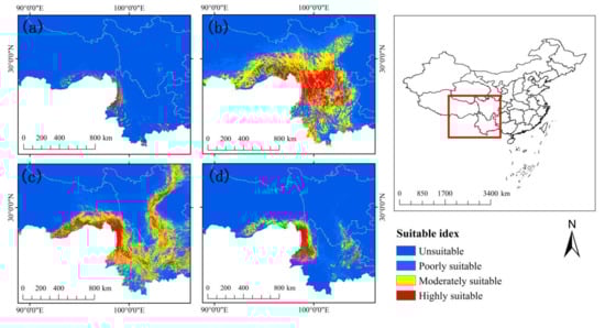 The potential current distribution of four Rhododendron species: (a) R. protistum, (b) R. rex subsp. rex, (c) R. praestans, (d) R. sinogrande.
