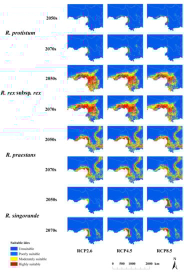 The overall trend of the centroid change of R. protistum will continue to be at high latitudes in the period current–2050s and 2050s–2070s under the three scenarios (Figure 6a), indicating that the climate sensitivity of the species will survive. R. rex subsp. rex will migrate to the northwest of the high latitude under RCP 4.5 and RCP 8.5, but under RCP 2.6, its centroid will move to low and then to high latitude (Figure 6b). For the centroid shift of R. praestans, it will move to high latitude, except for the period current–2050s under RCP 8.5 (Figure 6c). However, R. sinogrande is different from the former species, its centroid will change to high latitude first and then to low latitude under RCP 2.6 and RCP 4.5 (Figure 6d).
