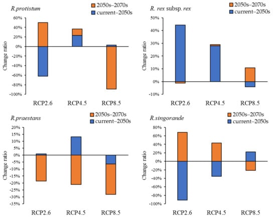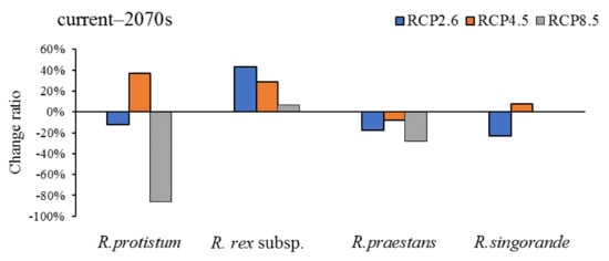 After a comparison of the high-suitability habitat change ratio of each species between two periods (current–2050s and 2050s–2070s) under RCP 2.6, RCP 4.5, and RCP 8.5 (Figure 5), we found that the high-suitability habitat of R. protistum and R. rex subsp. rex will increase in the two periods under RCP 4.5. However, R. protistum will exhibit a trend of shrinkage–expansion and expansion–shrinkage under RCP 2.6 and RCP 8.5, respectively. The high-suitability habitat will decrease sharply in the 2050s–2070s under RCP 8.5. Meanwhile, the high-suitability habitat of R. rex subsp. rex will increase by at most 44.38% within the current–2050s under RCP 2.6. The high-suitability habitat of R. praestans will increase first, then decrease under RCP 2.6 and RCP 4.5, and it will show a persistent shrinkage trend under RCP 8.5. On the contrary, the high-suitability habitat of R. sinogrande will decrease first, then increase under RCP 2.6 and RCP 4.5.