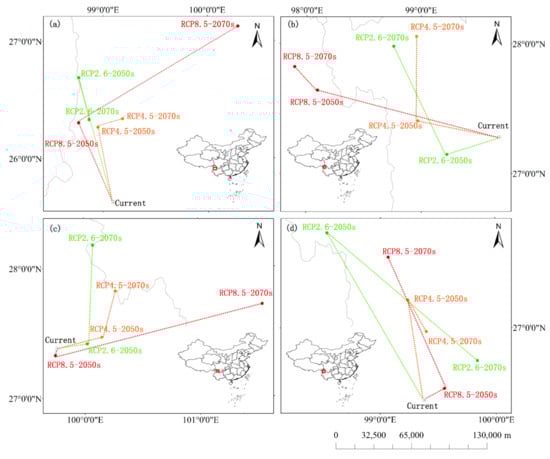 Map of centroid shifts of high-suitability habitats for four Rhododendron species from current–2050s and 2070s under RCP 2.6, RCP 4.5, and RCP 8.5. The green line depicts the shifting path of high-suitability habitats under RCP 2.6. The orange line depicts the shifting path of high-suitability habitats under RCP 4.5. The red line depicts the shifting path of high-suitability habitats under RCP 8.5. (a) R. protistum, (b) R. rex subsp. rex, (c) R. praestans, (d) R. sinogrande.