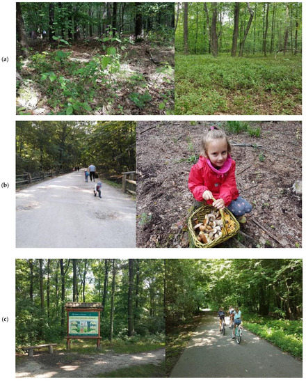 - Janeczko, E.; Woźnicka, M. Zagospodarowanie rekreacyjne lasów Warszawy w kontekście potrzeb i oczekiwań mieszkanców stolicy (Development of urban forest recreation of Warszaw in the context of the needs and expectations of the residents of the capital). Studia I Mater. Cent. Edukac. Przyr.-Leśnej 2009, 11, 131–139. [Google Scholar]