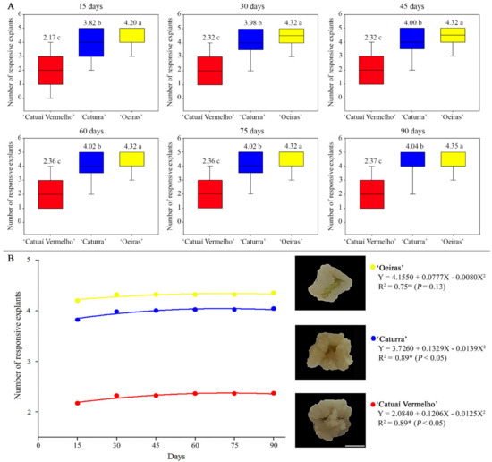 Mean number of responsive explants of ‘Catuaí Vermelho’, ‘Caturra’ and ‘Oeiras’ in callus induction and proliferation medium over 90 days. (A) The C. arabica lines exhibited distinct values of responsive explants over 90 days. (B) The adjusted model was significant (p < 0.05) by the quadratic polynomial regression for ‘Catuaí Vermelho’. All calli exhibited a pale-yellow color and friable appearance. Mean values followed by the same letter do not present a significant difference. Bar = 2 mm.