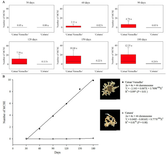 MCSE mean number for ‘Catuaí Vermelho’ and ‘Caturra’ in SE regeneration medium for 180 days. (A) Box plots show that ‘Catuaí Vermelho’ and ‘Caturra’ exhibited distinct MCSE mean numbers. (B) The adjusted model was significant (p < 0.01) by the quadratic polynomial regression for ‘Catuaí Vermelho”. The regenerated SE exhibited different stages of globular, cordiform, torpedo and cotyledonary development. Mean values followed by the same letter do not present a significant difference. Bar = 2 mm.
