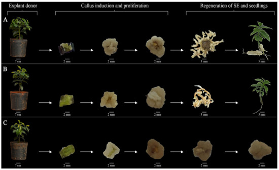 Indirect somatic embryogenesis (ISE) is an in vitro morphogenetic pathway that consists of cultivating segments of plant tissue in a sterile and specific culture medium, where callus is formed and, subsequently, somatic embryos (SE) giving rise to plantlets [12,13,14]. The capacity of the plant cell to organize and give rise to a new plant identical to the explant donor plant is based on the concept of cellular totipotency, postulated by Haberlandt in 1902 [15]. Cellular totipotency involves complex mechanisms of gene expression reprograming, cellular division and metabolism, and cellular development reprogramming [16]. The genetic [5], epigenetic [17,18] and physiological and/or morphological [15,19] aspects of the explant donors, as well as the conditions in vitro [4,20], influence ISE.