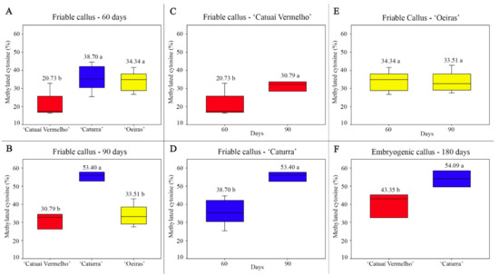 Embryogenic calli of ‘Catuaí Vermelho’ and ‘Caturra’ presented different methylated cytosine mean values (Figure 4F). The highest level of methylated cytosine was observed in embryogenic calli of ‘Caturra’ with 54.09%, while the embryogenic calli of ‘Catuaí Vermelho’ exhibited a mean value of 43.35% (Figure 4F). ‘Catuaí Vermelho’ had a 12.56% (30.79 to 43.35%) increase of methylated cytosine while ‘Caturra’ showed only a 0.69% increase (53.40 to 54.09%) (Figure 4B,F). In general, the step of induction and proliferation of friable calli was characterized by lower values of methylated cytosine, and the second step involving SE regeneration was marked by higher values of methylated cytosine.