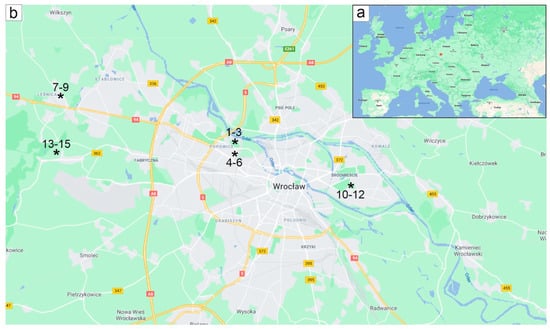 Map showing the location of the study area; (a) the city of Wrocław in a map of Europe; (b) magnification of Wrocław with the location of the study sites; sampling locations are marked by filled dots and analysed trees are numbered. Prepared using Google maps.