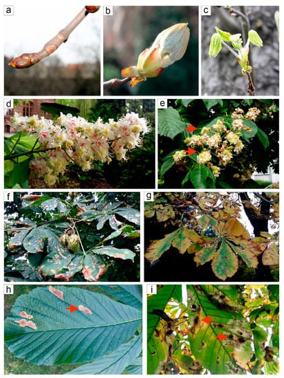 Annual changes in phenology and horse chestnut miner infestation on Aesculus hippocastanum during the year. (a) dormant bud; (b) bud swelling; (c) the emergence of the first leaves; (d) flowering; (e) formation of the first fruits, the remnants of pistils are still visible (arrows); (f) the mature fruits; (g) brownish and yellowish leaves in autumn; (h) stage 1; the first mines formed in the leaf as a result of the larvae feeding (arrow); (i) stage 2; more destroyed leaf with more mines (arrows).