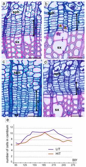 In both analysed groups of trees, cambium was dormant with 5–8 (average 6.5) cells in a radial row till the first third of April, (till the 95 day of the year (DOY); Figure 3a,e). The cambium became active on 12th April (102 DOY), which was marked by the first divisions in cambial cells (Figure 3b and Figure 4). At the same time, the first leaves appeared. As a result, the number of the cells in radial rows started to increase (Figure 3e). In the LIT, the tendency of increasing cell numbers was maintained during the growing season, reaching about 11–12 cells in a radial row from the end of May to the beginning of August (144–214 DOY; Figure 3c,e). In this group of trees, the cambium remained active until the second half of August (228 DOY), then divisional activity ceased and the number of cambial cells in radial rows decreased to nine (Figure 3d,e and Figure 4a). In contrast, in the HIT, after the onset of cambium activity at the beginning of April, the number of cambial cells in radial rows increased slowly, reaching a maximum (about 10–11 cells) on 5th July (158 DOY; Figure 3e and Figure 4b). Then, the number of cells decreased concomitantly with the progressive destruction of leaf blades due to leaf miner feeding. The last periclinal divisions, indicating the cessation of cambium activity, were observed in the middle of July (200 DOY; Figure 4b), which was followed by precocious leaf senescence. During the entire growing season, the average number of cambial cells in radial rows was lower in HIT than in LIT (Figure 3e).