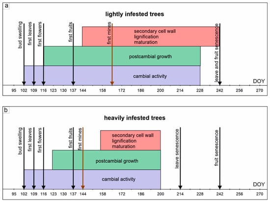The duration of cambium activity and of successive stages of differentiation of secondary xylem cells in lightly (a) and heavily infested (b) trees of Aesculus hippocastanum. The length of the rectangles indicates the mean onset and cessation of the analysed stages during the year. The vertical lines indicate the dates when the successive phenological stages and symptoms of horse chestnut infestation was observed. In HIT, the duration of cambium activity was shortened by about one month, which resulted in the shortening of the successive stages of wood differentiation. This shortening can be attributable to the difference in the level of infestation of the previous years; DOY—day of the year.
