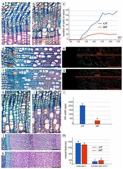 In both groups of trees examined, after the beginning of cambium activity (102 DOY) almost to the end of April (116 DOY), new secondary xylem cells were not established (Figure 4 and Figure 5a). From this time, and throughout the growing season, new wood cells were constantly formed as a result of divisional activity in the cambium and the continuing process of differentiation (Figure 5b,c). The first evidence of wood cell differentiation was visible as an increase in the length and width of cells, termed the postcambial phase, that occurred in the LIT about two weeks after the first divisions in the cambium, i.e., in the last third of April (116 DOY; Figure 4a and Figure 5b). In HIT, the process of wood differentiation started one week later, at the beginning of May (123 DOY; Figure 4b). The number of wood cells formed in the current year increased significantly coinciding with the end of flowering, from the middle of May (137 DOY); however, this increase was more pronounced in the LIT than in HIT (Figure 5c). Approximately four weeks after the appearance of the first wood cells, the deposition of the secondary cell wall and the processes of lignification and cell maturation were observed simultaneously in both groups of trees (Figure 4 and Figure 5d–g).