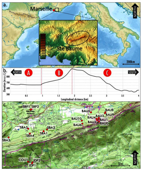 - Quertier, P.; Guicheteau, D. Site Natura 2000 PR 110–FR 9301606 Massif de la Sainte Baume—Document d’Objectifs Natura 2000; Muséum National d’Histoire Naturelle: Paris, France, 2001. [Google Scholar]