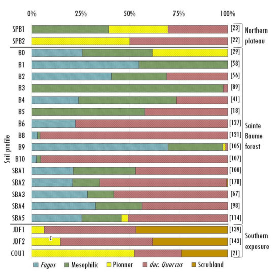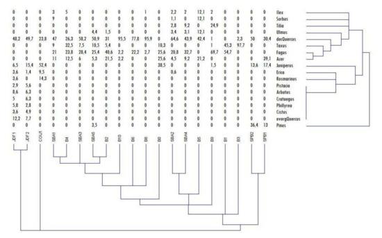| Units of Investigation | Profile of Sampling | Nbr of Ident. | Fagus | Juniperus | Acer | Taxus | Dec. Quercus | Everg. Quercus | Ulmus | Ilex | Sorbus | Tilia | Cistus | Pinus | Erica | Phillyrea | Crataegus | Rosmarinus | Arbutus | Pistacia |