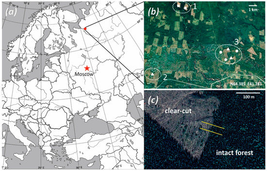 Bilberry spruce stands are the most widespread forest type in the European boreal zone. Spruce timber is widely used in paper-making and construction. A major part of spruce stands has been altered by varying-intensity clear-cutting and selection cutting. Clear-cutting is the main method of timber harvesting in the boreal zone of Russia. This method is the most profitable but causes substantial landscape fragmentation (Figure 1b) and reduction of the natural forest area, thereby jeopardizing the inhabitants of old-growth forest communities [1]. The most critical problems of the consequences of clear-cuttings are reducing the biological diversity of the territory and restoring forests. These problems have been widely discussed in scientific literature since the 1980s. There is now an understanding that vulnerable species can be conserved not only through strict protection of natural forests but also by modifying the logging practices. One of the approaches, termed Variable Retention Forestry (VRF), is to retain trees in cut-over sites, to have a larger cut-over area remaining under the edge of the forest influence, etc. [1,2,3,4,5,6].