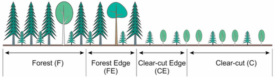 We applied Kruskal-Wallis ANOVA for comparisons between the data split into four groups based on the EC zone they belonged to: 1—forest (F), 2—forest edge towards the forest (FE), 3—clear-cut along forest edge (CE), 4—clear-cut (C) (Figure 2).