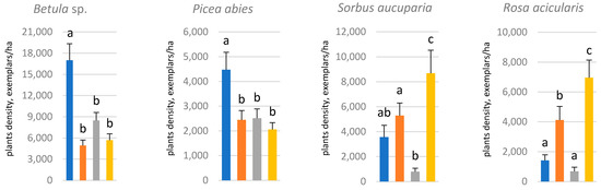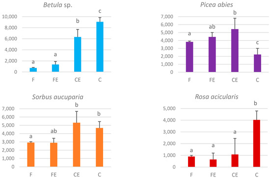 Average amounts of regeneration and understory in all the surveyed transects, plants/ha: birch, spruce, rowan, and prickly rose in the bilberry spruce forest—clear-cut EC (mean and standard error) for transitional zone width of 8 m in each direction from the forest edge. Legend as in Figure 2. Letters indicate differences between means (based on ANOVA results).