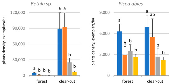 Birch regeneration in clear-cut sites gained in numbers as time passes since cutting. Birch is known for frequent and abundant seed-bearing and intensive growth [58,59]. It can, therefore, rapidly capture the released spaces, occupying the dominant position [56]. Another factor is its capacity for vegetative propagation—after a stand comprising birch is logged down, birch begins to regenerate rapidly and grow actively [60].