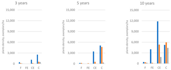 The distribution of birch regeneration over the bilberry spruce forest—clear-cut EC showed its amount to be significantly lower under the spruce canopy (F zone) than in the adjacent clear-cut (C zone) irrespective of the time since cutting (Figure 6). Only the FE zone in the 10-year-old clear-cut has an increased amount of regenerating birch up to 0.5 m high. The amount of naturally regenerating birch in the CE and C zones increased with time since cutting.