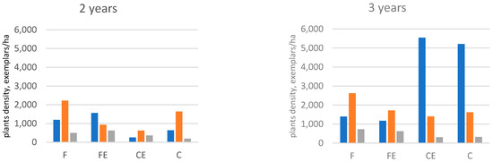 The density of rowan regeneration in open spaces (in C and CE zones) was about 1.5 times higher than under the forest canopy (F and FE zones) (Figure 5).
