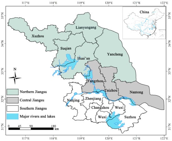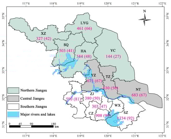 Jiangsu Province (30°45′–35°08′ N, 116°21′–121°56′ E) covers 107,200 km2 of land area. It is located in the central part of the eastern coast region of China. Jiangsu borders Shandong in the north, Anhui to the west, and Zhejiang to the south, and is on the west side of the Yellow Sea. Its landform is mainly plain with multitudinous lakes, and the highest elevation is 624.4 m. It has a warm, temperate humid monsoon climate in the north and subtropical humid monsoon climate in the south. The annual average temperature is 13–16 °C, and the annual average precipitation is 998.5 mm []. The main soil types of Jiangsu from north to south are brown soil, leached cinnamon soil, yellow–brown soil, and red–yellow soil. The province covers a forest area of 15,600 km2, with 24.0% forest coverage rate. Geographically, it can be divided into three subregions: southern Jiangsu (S. Jiangsu), central Jiangsu (C. Jiangsu), and northern Jiangsu (N. Jiangsu), with 13 prefecture-level cities in total (Figure 1). These cities’ key information is summarized in Table 1 [].