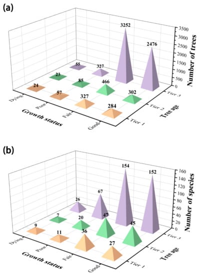 The counts and species of heritage trees in Jiangsu Province, eastern China: (a) number of trees; (b) number of species across four growth status and three tree ages.