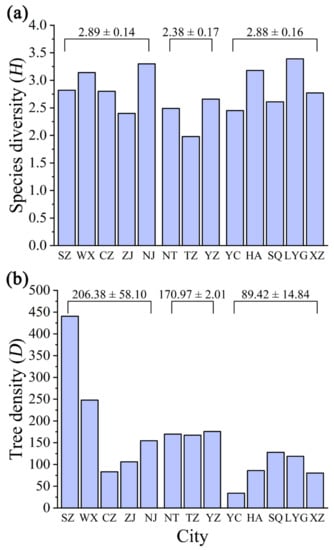 Comparison of spatial distribution by 13 cities in Jiangsu Province, eastern China: (a) species diversity and (b) tree density. The different data above the bars in (a,b) indicate the mean ± standard error of southern Jiangsu (including SZ, WX, CZ, ZJ, and NJ), central Jiangsu (NT, TZ, and YZ) and northern Jiangsu (YC, HA, SQ, LYG, and XZ), respectively. Refer to Table 1 for the meaning of the abbreviated cities.