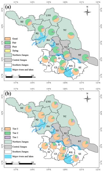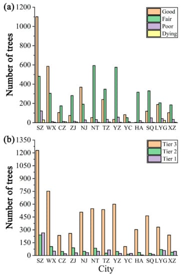 As shown in Figure 5a, the number of four growth states of heritage trees varied greatly in each city. Suzhou had the most heritage trees with “good” growth (i.e., 1101 trees) while Nantong had the most trees with “fair” growth (i.e., 594 trees). For each city, the sum of “good” and “fair” was greater than 90% of the total number of trees, whereas there were very few “poor” and “dying” trees therein (Figure 6a).