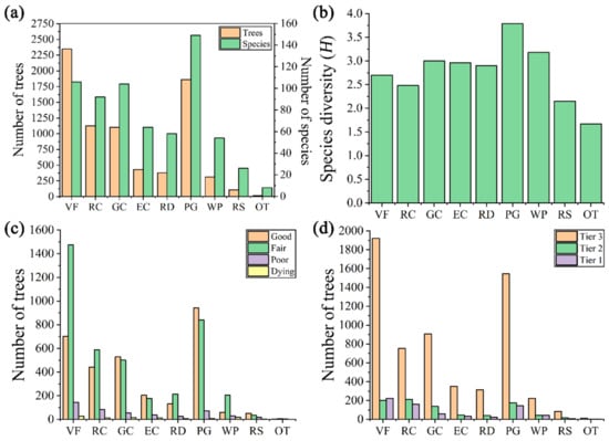 Comparison of spatial distribution by nine tree habitats in Jiangsu Province, eastern China: (a) number of trees and species, (b) species diversity index, (c) abundance by growth status, and (d) abundance by tree age. Refer to Table 3 for the meaning of the abbreviated tree habitats.