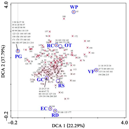 The first two axes of the DCA ordination of nine tree habitats and heritage tree species composition in Jiangsu Province, eastern China. Tree habitat types are presented as circles, and species as crosses. Refer to Table 3 for the meaning of the abbreviated tree habitats, and Table A1 for the numerical order of species names.