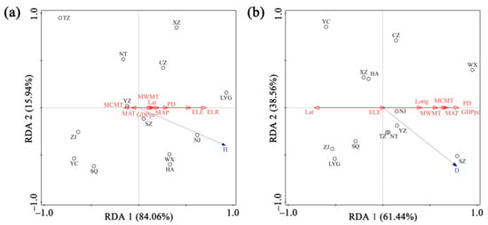 Redundancy analysis (RDA) indicated that diversity of heritage trees was mainly influenced by elevation range shift (ELR) among 13 cities of Jiangsu (Figure 9a). Elevation range shift could be used to reflect habitat heterogeneity [,]. Different trees species have distinctive characteristics, thereby affording them extensive adaptability for temperature, water, and elevation ranges. In a certain area, habitat heterogeneity increases with ELR, which can contribute to a greater variety of microhabitats for accommodating more trees [,]. Furthermore, there is no remarkable difference in climatic conditions at small and medium geographic scales. Accordingly, topographic heterogeneity is considered as a leading factor influencing distribution pattern of species diversity []. Thus, ELR becomes a key factor shaping the spatial differentiation of ancient tree diversity at the medium scale of distribution area.
