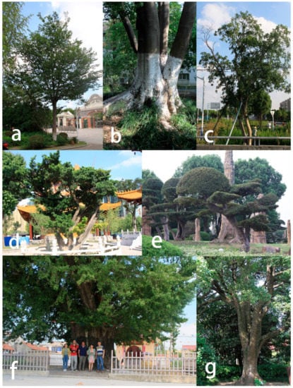 Heritage trees, at least 100 years old, tend to be large in size: tree height, crown spread, and/or trunk girth []. Therefore, they can form the urban landscape, and create an amenity urban environment for human beings [,]. For example, ancient trees can provide shade for pedestrians through spreading branches and thick foliage and help them keep from overheating by transpiration during the summer. This is of high importance in densely populated areas of a city. Most ancient trees also have a variety of ornamental value, such as thick trunks, fragrant flowers and fruit, or colorful leaves in different seasons []. Take Cinnamomum camphora as an example; it contains a special aroma and volatile oil when in blossom. Another example is Ginkgo biloba, whose green leaves in summer turn into golden yellow in autumn. In addition, its seeds are edible. Therefore, ancient trees in tandem with urban architecture can become a unique landscape unit or a beautiful landmark of the city.