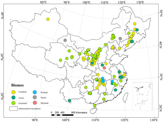 Data from papers published in English were based on the three main databases of Clarivate Analytics’ ISI Web of Sciences Core Collection™ (WOS, http://apps.webofknowledge.com/ accessed on 20 September 2021): Science Citation Index-Expanded™ (SCI-E, Science Citation Index), Social Sciences Citation Index™ (SSCI, Social Sciences Citation Index), and Art & Humanities Citation Index® (A & HCI, Arts and Humanities Citation Index). An advanced search function was adopted, and the source of the journal was not limited. The subject heading used was “(TS = microbial C OR TS = microbial N OR TS = microbial P)”. Data from papers published in Chinese came from the Chinese Journals Full-text Database of China National Knowledge Infrastructure (CNKI, http://www.cnki.net/ accessed on 20 September 2021) using professional retrieval, unlimited journal sources, and the subject words “microbial biomass carbon (MBC)”, “microbial biomass nitrogen (MBN)”, and “microbial biomass phosphorus (MBP)”. Nonacademic newspapers, publications, calls for papers, reports, international and domestic conferences, miscellaneous talks, scientific anecdotes, and other papers that were not significantly related were excluded. To achieve the purpose of our studies and reduce the potential bias in the screening of papers, three screening criteria for the collected data were used: (a) the papers contained concentrations of at least two elements for soil C, N, and P and soil microbial biomass C, N, and P measurements; (b) the soil microbial biomass (including bacteria and fungi) in the papers was determined based on the fumigation-extraction (FE) method [22]; (c) papers examining the addition of nutrients to the soil were not included; (d) the content of soil C, N, and P in the study was greater than the content of soil microbial biomass C, N, and P; and (e) if the original study reported the vertical distribution of elements in the soil, only the surface (thickness 0–20 cm) soil data were selected for our study. Based on the above screening criteria, 170 research papers that met the requirements were finally obtained, and 404 sets of data were extracted (using Getdata software to extract the data from graphs in the original papers or directly extracting the data from tables in the original papers). According to the sample plot locations and vegetation coverage given in the literature, all sample plots in the database were divided for statistical analysis into 6 specific ecosystem types: grassland (91), forest (122), cropland (157), wetland (14), desert (18), and bare land (2) (Figure 2).