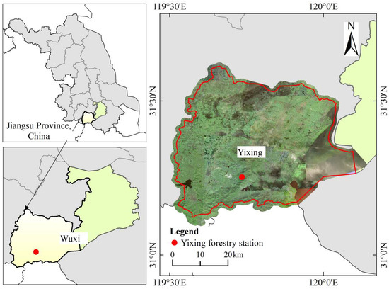 The study was carried out in Yixing forest farm (31°15′1″–31°15′12″ N, 119°44′2″–119°44′8″ E), located in southern Jiangsu Province, China (Figure 1). It is the northeast marginal area of Moso bamboo distribution in China, which is typical and representative with obvious regional advantages [13]. The region is characterized by a marine monsoon climate with average precipitation and temperature of 1167 mm and 15.7 °C per year, respectively. The dominant tree species include Phyllostachys edulis, Cunninghamia lanceolata, Pinus thunbergii, Pinus massoniana, and Quercus acutissima. The farm was established in March 1950 and has 120 ha of Moso bamboo pure forest. The average DBH and bamboo heights are 8.13 cm and 13.37 m, and the average tree density is 3375 stems ha−1. The management of Moso bamboo forest includes cutting trees older than 6 years, digging out all bamboo shoots in the off-year, and selecting and digging out the shoots that cannot become trees in the on-year. Therefore, it is necessary to distinguish the on-year and off-year. The prominent understory species include Salvia prionitis, Oxalis corniculata, Carex breviculmis, Paederia cruddasiana, and Hedyotis chrysotricha.