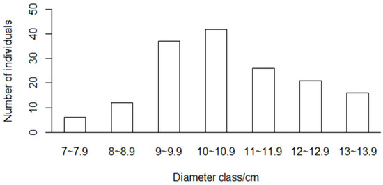 We chose the strong bamboo shoots without nearby shoot growth to avoid confusion between different bamboo shoot sheaths. We randomly selected and numbered 216 bamboo shoots with different diameters in Yixing forest farm and collected shedded sheaths daily. The sheaths of the same bamboo shoot were clamped together with clamps and labeled accordingly to record the numbering of the bamboo sheaths. The collected culm sheaths were brought back to the laboratory, dried to constant weight at 80 °C, and weighed and recorded with an electronic scale. The total biomass of the bamboo sheath of the same tree was calculated by Equation (1). Culm sheaths begin to shed from the bottom, falling off completely at about 40−50 days. However, the culm tips of some bamboo were broken by strong winds, and the shoot sheath biomass of 160 new trees was collected. The DBH, H, and IL were measured after the sheath was exfoliated. Multicollinearity among independent variables was verified by applying the variance inflation factor (VIF) test, and no multicollinearity was found among the independent variables included (VIF < 5). The distribution of new bamboo trees in DBH is provided in Figure 2, and the descriptive statistics of Moso bamboo shoot sheath biomass modeling variables are listed in Table 1.
