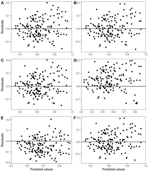 Residuals plots of W1 (A), W2 (B), W3 (C), W4 (D), W5 (E), and W6 (F) of Moso bamboo shoot sheaths.