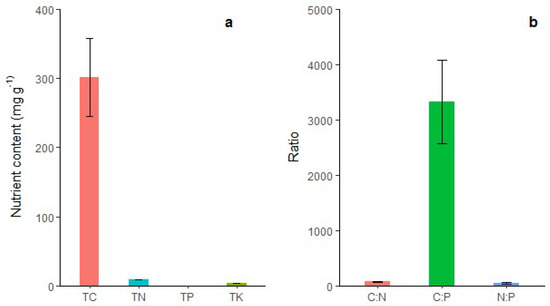 (a) Total carbon (TC), total nitrogen (TN), total phosphorus (TP), total potassium (TK); and (b) carbon/nitrogen ratio (C:N), carbon/phosphorus ratio (C:P), and nitrogen/phosphorus ratio (N:P) of shoot sheaths in Moso bamboo forest. The error bars indicate the standard deviation (SD). The labels are the mean values of each parameter.