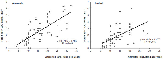 Mean SOC stock in the forest floor of Arenosols and Luvisols increased following stand age in afforested land (Figure 2). For Arenosols, the obtained R2 equals 0.507 (p < 0.001), and it means that 50.7% of the variability of SOC stock values in forest floor is explained by stand age in afforested land. For Luvisols, the R2 equals 0.361 (p < 0.001), explaining 36% of the variability. Therefore, it could be assumed that the relationship between SOC stocks in forest floor and stand age is relatively strong.