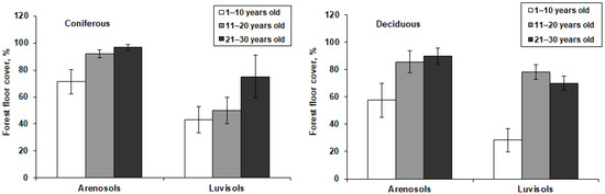 The highest mean mass, percentage cover and SOC stocks of forest floor (OL + OF + OH) was accounted for afforested Arenosols and Luvisols representing the 21–30-year-old stands (Table 2; Figure 3). The mean mass and SOC stocks of forest floor almost doubled during each decade after afforestation. The mean mass of forest floor was 1.6–1.7 times higher in the 1–30-year-old deciduous stands than in the coniferous stands (Table 2). Arenosols were attributed to higher mean mass and SOC stocks of forest floor than Luvisols. The mean mass of forest floor in both afforested Arenosols and Luvisols (1–30 years old, coniferous, and deciduous) was significantly higher than litter mass of perennial grassland that developed due to sod formation. The mean plant litter mass of cropland was assumed to be zero.