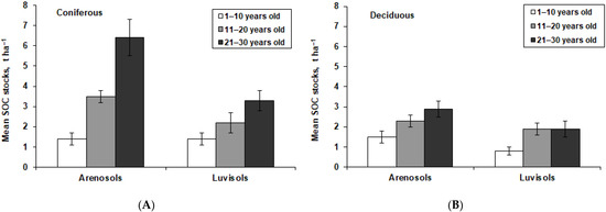 The current study found a slightly higher mean bulk density of fine (<2 mm) soil in the 0–30 cm mineral topsoil layer of nutrient-rich Luvisol than in Arenosol. Also, higher variations of mean bulk density values were observed in the 0–10 cm mineral topsoil layer. In afforested Luvisol, the mean bulk density was the lowest in the 21–30-year-old stands. The mean bulk density of croplands was higher than that of other land uses, which caused relatively high SOC stocks. In contrast to croplands, a clear decreasing trend in mean bulk density due to forest stand age was found in Luvisols and Arenosols, with the lowest values in the 21–30-year-old stands in the afforested land. The afforestation and stand age tend to decrease the soil bulk density and increase soil porosity [62,63]. The current study found that the mean bulk density after afforestation with coniferous species was similar to deciduous during the entire 30-year period. These results were consistent with the previous studies, which found no significant difference between coniferous and broadleaved stands for mineral soil horizons [56].