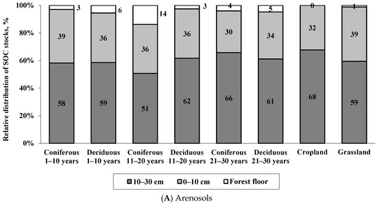 Relative distributions of mean SOC stocks in forest floor or grassland litter and mineral topsoil layers in afforested land, cropland and grassland were obtained for coniferous and deciduous stands in Arenosols and Luvisols (Figure 4). In nutrient-poor Arenosols, the SOC stocks in the forest floor have accumulated more rapidly with increasing stand age than in Luvisols. For Arenosols afforested with coniferous species, the SOC stock in forest floor represented 3%, 6% and 14% of the total SOC stock up to 30 cm depth in the 1–10-year-old, 11–20-year-old, and 21–30-year-old afforested sites, respectively. For Arenosols afforested with deciduous species, the SOC stock in forest floor comprised 3%, 3% and 5% of the total SOC stock in representative afforested sites. A low proportion of SOC in the forest floor was obtained in Luvisols afforested with both coniferous (2 to 5%) and deciduous (1 to 3%) species. For both studied soils, a relatively lower proportion of SOC accumulated in the 0–10 cm mineral topsoil layer than in the 10–30 topsoil layer following afforestation. The 0–10 cm topsoil layer of grassland represented a higher proportion of SOC than the 10–30 cm topsoil layer in cropland.