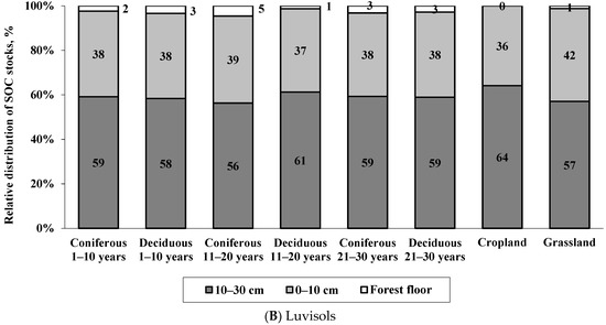 Relative distribution (%) of mean stocks of soil organic carbon (SOC) in forest floor/litter of perennial grassland, 0–10 cm, and 10–30 cm mineral topsoil layers in nutrient-poor Arenosol (A) and nutrient-rich Luvisol (B) in the 1–10-year-old, 11–20-year-old and 21–30-year-old coniferous and deciduous stands, cropland, and grassland.