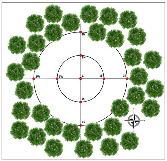 Nine circular sub-plots of 3.14 m2 (100 cm radius) were established inside each gap. In detail, (i) one sub-plot was positioned in the centre of each gap (C); (ii) four sub-plot were located at one-half of the radius starting from the centre to the gap edge along the cardinal directions (1N, 1E; 1S, 1W); and (iii) four sub-plot were located at the edge of gap along the cardinal directions (2N, 2E, 2S, 2W) (Figure 1). A total of 81 sub-plot were established, 27 for each gap size. The area covered by the subplots referred to points (i) and (ii) was defined as the “center of a gap”, while the area covered by the subplots referred to point (iii) was defined as the “gap edge”.