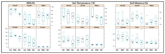 Median values and related variability of Photosynthetically active radiation (PAR), Soil temperature and Soil moisture in each gap size for each cardinal point and in forest. LG, large gap; MG, medium gap; SG, small gap. The solid dot indicates the median values. In the box, the lower limit corresponds to the value of the first quartile (Q1) of the distribution and the upper limit to the third quartile (Q3); the vertical lines (whiskers) delimit the intervals in which the lower values of Q1 (in the lower part) and the greater values of Q2 (in the upper part) are positioned. Outliers are reported as empty dots.