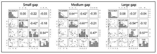 Scatterplot matrix with Pearson correlations. REGENER, natural regeneration; MOISTURE, soil moisture; TEMP, soil temperature; PAR, photosynthetically active radiation. For each gap size, n = 27. Asterisks stand for p-values: ***: p < 0.001; **: p < 0.01; * p < 0.05.