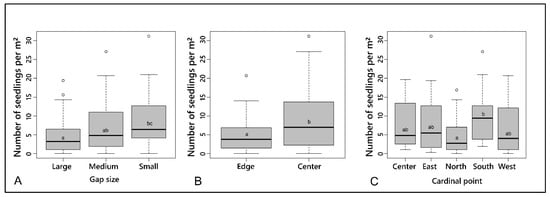 Number of seedlings per m2 per gap-size (A), number of seedlings in the edge and in the center of gaps (B), in cardinal point (C). The box plots explanations are as in Figure 2, with the difference of the median values represented here by the heavy horizontal line. Boxes with different letters indicate significant differences in number of seedlings per m2 (p < 0.05).
