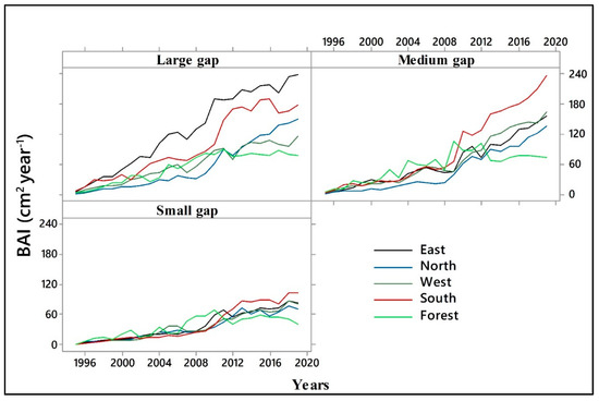 For each gap size, Figure 5 shows the BAI values obtained for trees sampled in each cardinal point and for trees sampled in forest, outside the gaps. In general, BAI increased over time for all trees. Until 2008–2010, BAI values, although varying from year to year between different conditions, had a similar trend. Later (after the gap’s opening), trees had higher BAI in the south in medium and small gaps and in the east and south in large gaps, while had a lower BAI in the north and west in each gap. Finally, for trees sampled in forest, BAI values similar to the trees sampled in the gap were observed until 2009–2010. Later, a consistent decrease BAI values were observed for the period 2010–2019.