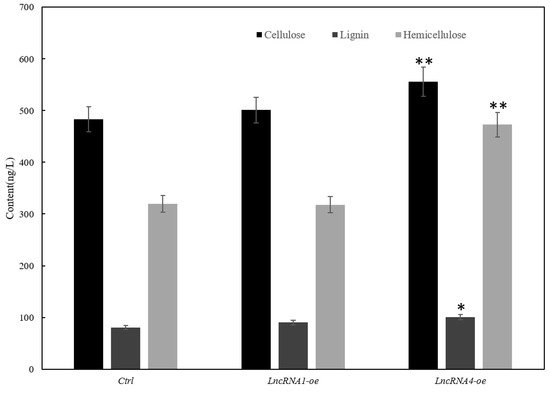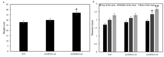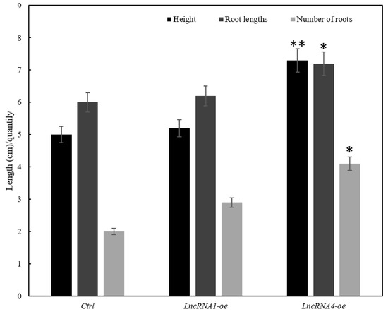 3.8. Effects of Overexpression of lncRNA1 and lncRNA4 on Plant Growth